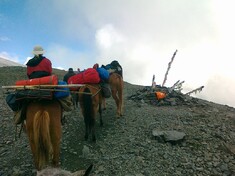 8. den nás ale potěšil stydlivými paprsky vycházejícího sluníčka. Nasedli jsme se na silné koně a vyrazili jsme na náš druhý hřeben, jenž nás vedl od sněhových poli Běluchy do úrodnější a teplé doliny řeky Kučerla. Ani jsme netušili, že následující slíbené 2 hodiny výstupu budou tak dlouhé a napínavé. Těžce naložení, namáhavě oddychující koně stoupali vzhůru. Cesta byla kamenitá, ale místy se jim kopyta bouřili do bláta.